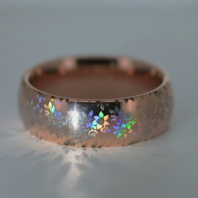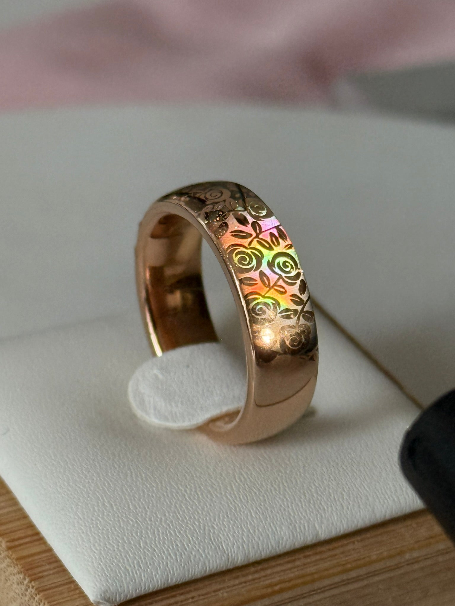 Tento elegantní prsten zdobí plynulý květnový motiv vygravírovaný s dokonalou laserovou přesností. Jemný lesk a detailní textura vytvářejí energii, která se proměňuje s každým úhlem pohledu.