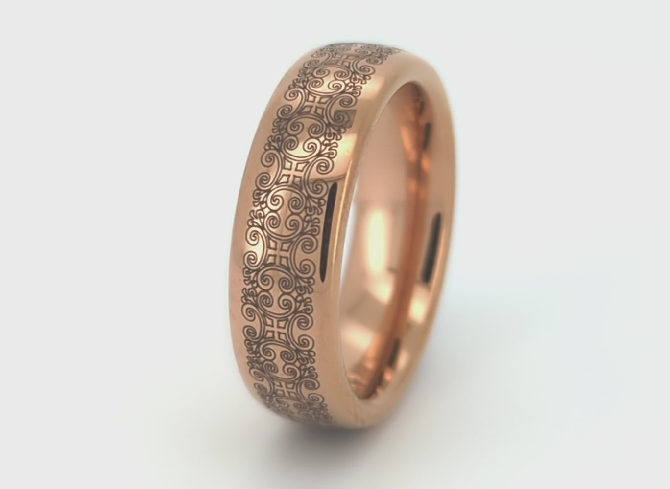 Rose gold tungsten ring with intricate antique-style engraving and a rose gold interior, isolated on a white background.